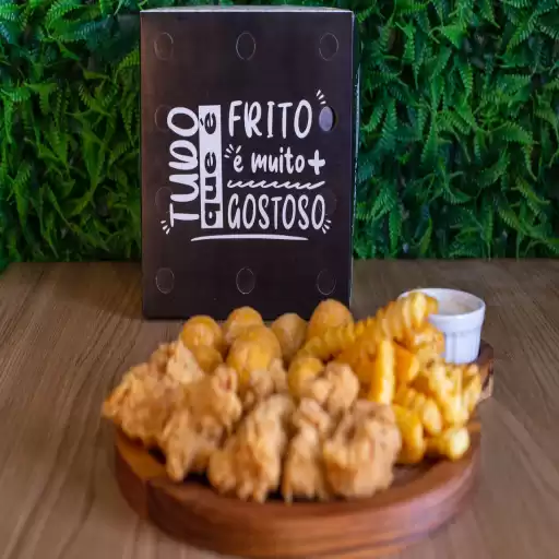 Filé de peito empanado, crocante por fora e macio por dentro. Acompanha batata frita e bolinha de queijo