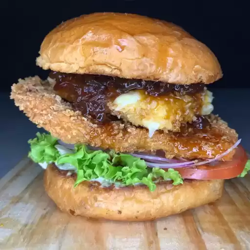 Frango empanado, queijo empanado, cebola caramelizada, alface, tomate, cebola roxa e pão de brioche
