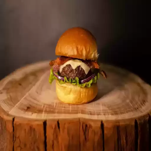 Burger de 150g, bacon crocante, alface, tomate, cebola roxa, molho especial, pão de brioche e queijo muçarela