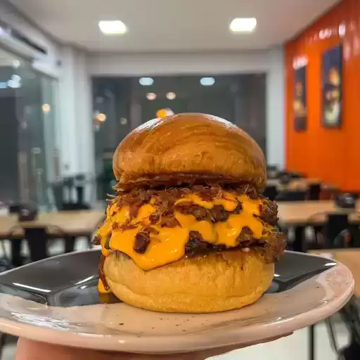 Burger de 150g, queijo cheddar, molho barbecue, bacon crocante, cebola caramelizada, pão de brioche e cebola crispy