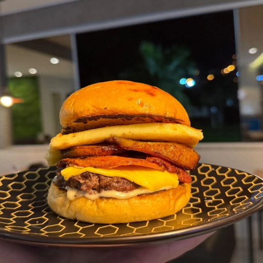 PÃO DE BRIOCHE, BUURGER 150G, QUEIJO PRATO, BACON, QUEIJO COALHO SELADO, MEL, BANANA FRITA E MOLHO ESPECIAL