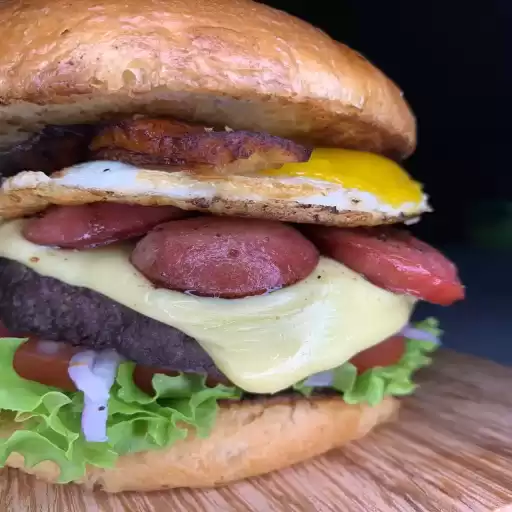 Burger de 150g, calabresa, ovo, banana frita, alface, tomate, cebola roxa e queijo cheddar