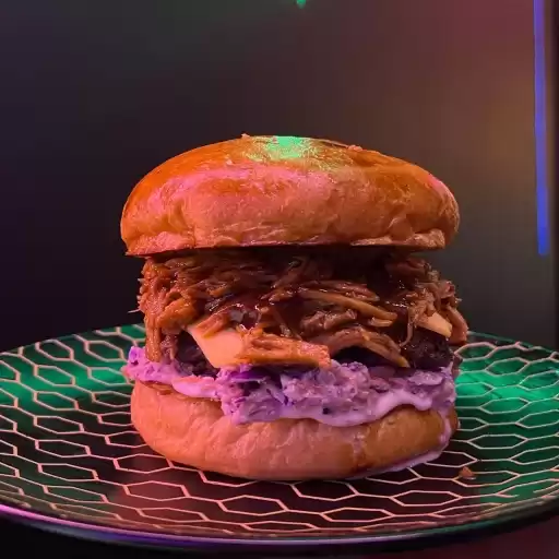 PÃO DE BRIOCHE, BURGER 150G, QUEIJO MUÇARELA, SALADA COLESLAW, PULLED PORK (PERNIL SUINO DESFIADO), MOLHO BARBECUE